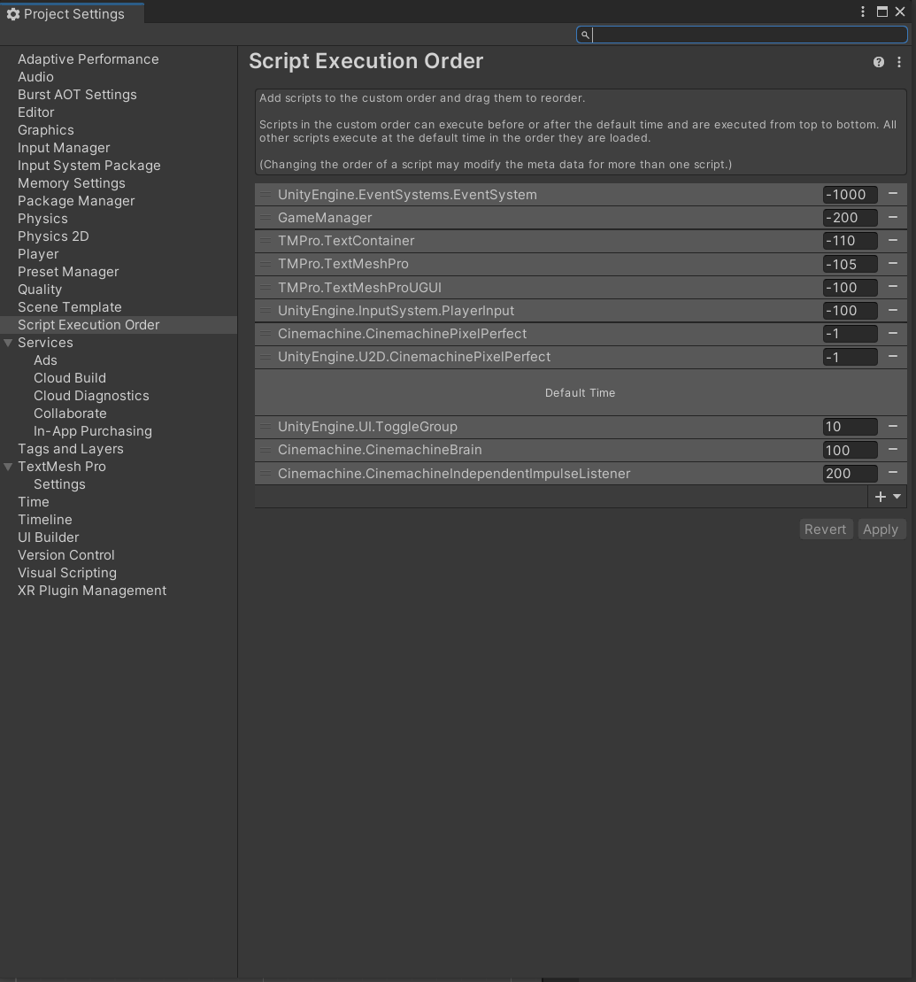 GameManager 클래스를 추가하고, Default Time 이전에 우선적으로 실행되도록 순서를 변경.