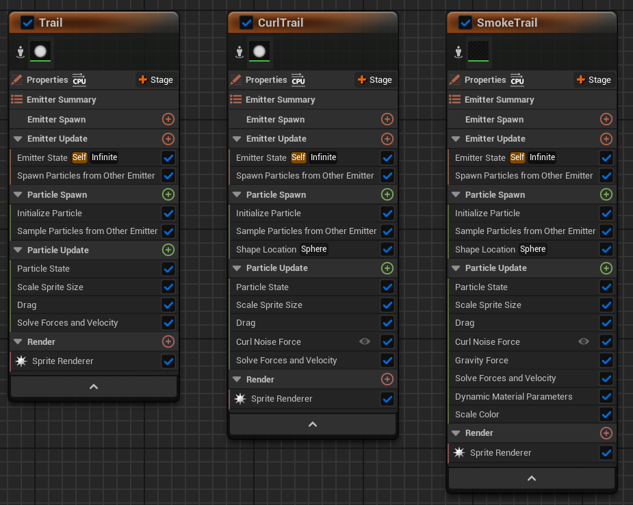 Emitter에서 파티클을 생성하며 궤적 내 흔적을 남기는 방식으로 동작이 이뤄진다.