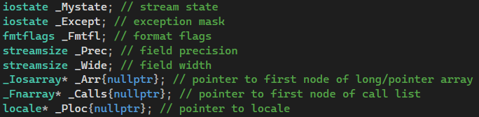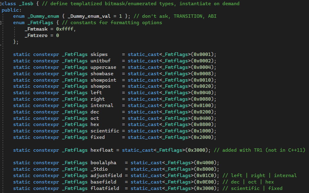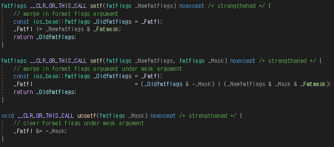 이때, fmtflags는 int형으로 bitmask 방식으로 동작이 이뤄진다. (mask에 대한 동작 방식은 '_Iosb' class 내에 정의되어있다.)